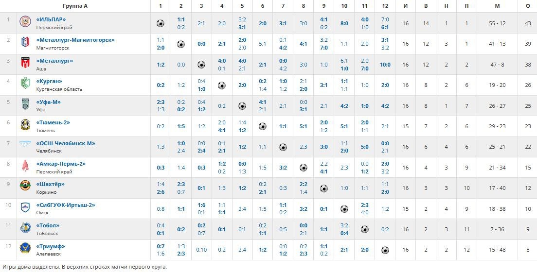 Турнирная таблица после окончания 16-тура по футболу третий лиги