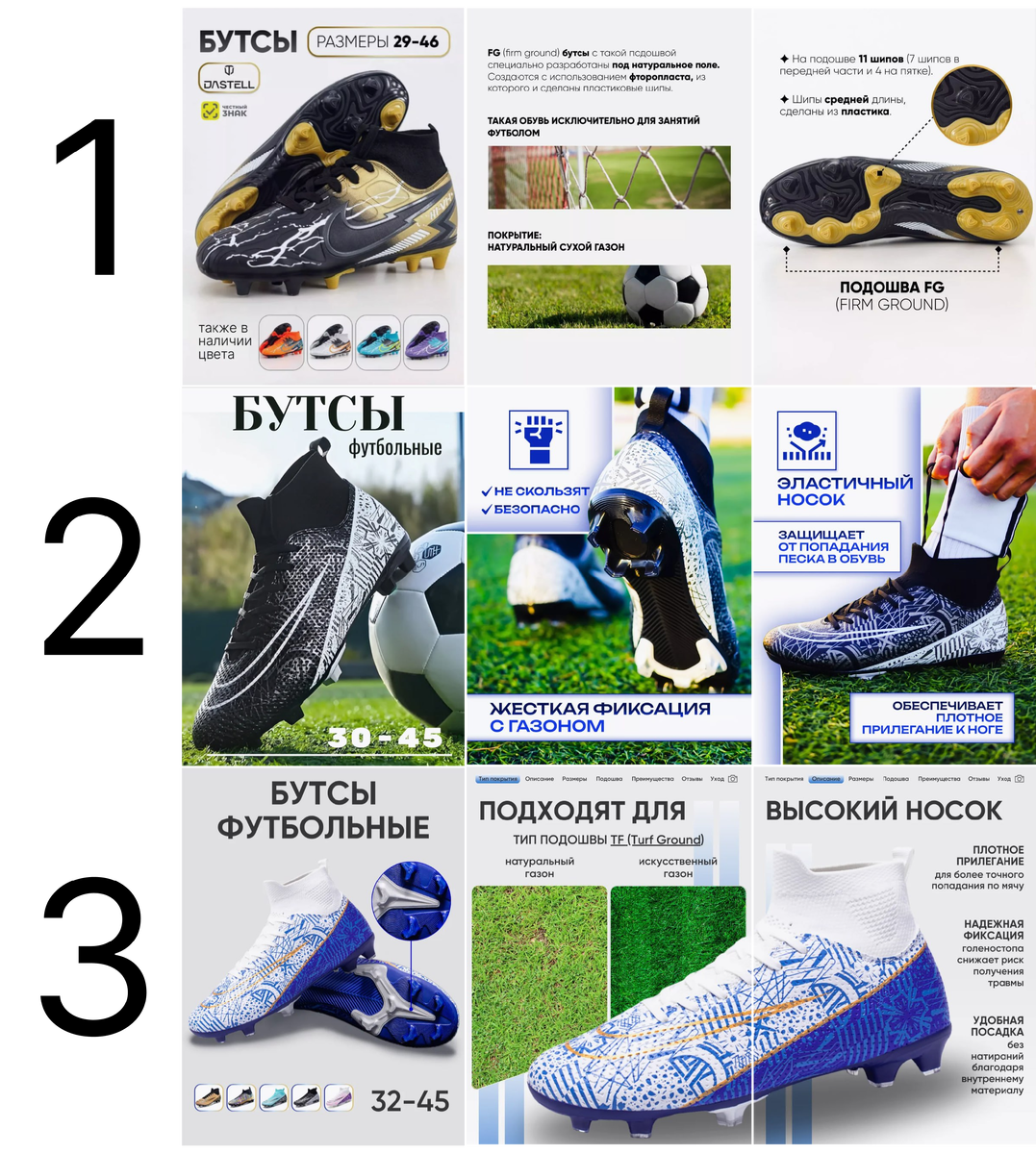 Сразу скажу, что у всех много слайдов. Очень функциональный товар. У первых двух карточек после обложки идет крупное изображение бутсы без инфографики - эти слайды упустила. Главное - показать принцип, как устроены карточки. Слайдов там очень много.