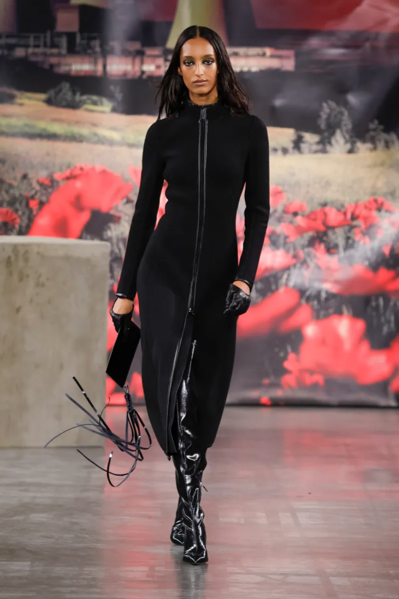 Koch вытащила из архивов 80-х «power dressing» и сделала вид, что это её маленький фетиш. Но там, где у старого power dressing была скучная идея про женщин, которые надевают мужские костюмы, чтобы выжить в офисе, тут всё иначе. Тут нет попытки спрятаться за плечиками и галстуком. Тут наоборот — тонкий, прилипший к телу силуэт, который говорит: «Я пришла за твоим контрактом и твоей нервной системой».