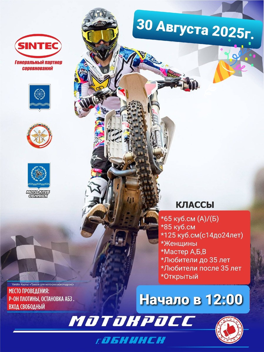 🚩30 августа на спортивных трассах, расположенных рядом с плотиной (возле АБЗ), состоится традиционный летний мотокросс, приуроченный ко Дню города. В соревнованиях примут участие около 150 спортсменов из 16 регионов России. Церемония открытия и приветствие участников пройдут в 11:45, а в 12:00 начнутся заезды. Все желающие могут посетить это яркое спортивное событие!