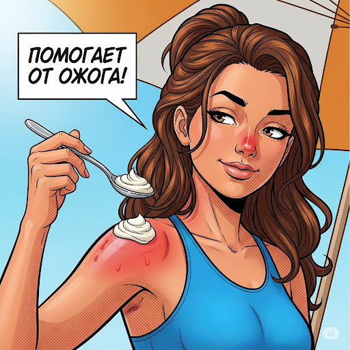 * Сметана — это главный герой нашего спасения. Она содержит молочную кислоту и жиры, которые увлажняют кожу и создают защитную пленку, не давая влаге испаряться. Наши предки верили, что «сметана впитывает в себя жар и возвращает коже прохладу». А еще она содержит полезные бактерии, которые помогают коже быстрее восстанавливаться.