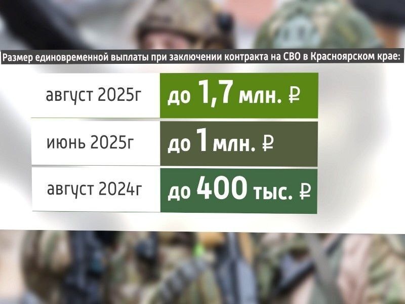 В Красноярском крае увеличены выплаты военнослужащим в зоне СВО Теперь те, кто заключит контракт с 15 августа, получат до миллиона 700 тысяч рублей. Для тех, кто уже мобилизован и заключил контракт – до 2 миллионов рублей. Такое решение приняли на заседании краевого правительства. Напомним, в июне этого года в нашем регионе размер единовременной выплаты увеличили до миллиона рублей, а до этого он составлял 400 тысяч рублей. @Источник: https://t.me/vesti_krsk