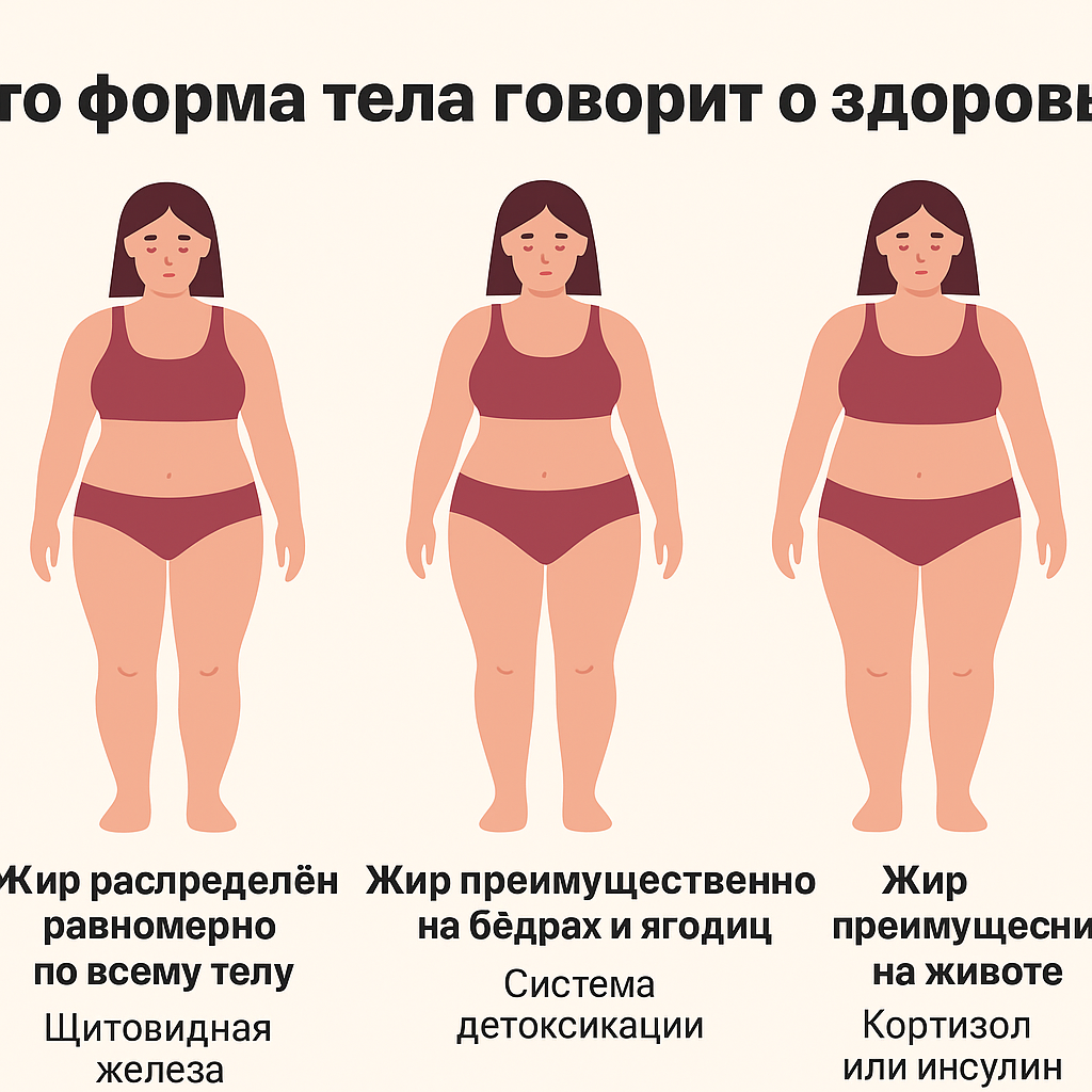 Когда женщины начинают задумываться о похудении, чаще всего они смотрят только на цифру на весах. Но на самом деле важнее не сколько жира, а где именно он откладывается. Место накопления лишних килограммов может многое рассказать о гормонах, обмене веществ и даже о том, какой органу нужна поддержка в первую очередь. Если женщина набирает вес сразу «везде» — руки, ноги, живот, лицо — это может быть связано с работой щитовидной железы. При снижении уровня гормонов щитовидки (гипотиреозе) замедляется обмен веществ: 📖 Исследования показывают, что при гипотиреозе увеличивается общий процент жировой массы и снижается чувствительность к инсулину (PMCID: PMC7000587). 👉 С чего начать: Это так называемый гиноидный тип ожирения («по-женскому типу»). Он связан с работой эстрогенов и системой их выведения (печень + кишечник). Когда печень и кишечник не справляются с переработкой гормонов, уровень эстрогена повышается, и организм «складывает» жир в зону бёдер и ягодиц. 📖 В обзорах (Endocrine Re