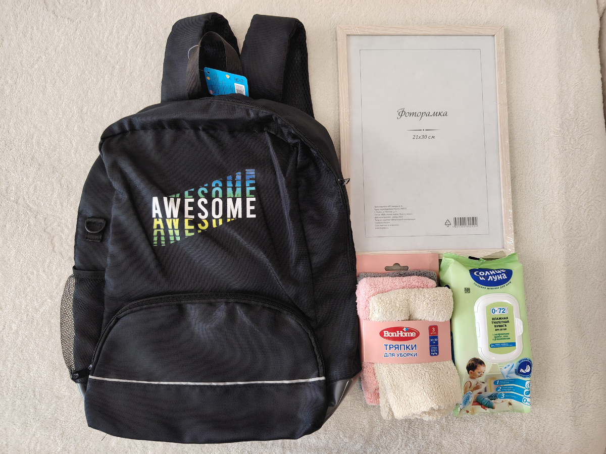 Забежала сегодня в магазин Фикс прайс. Надо было купить фоторамку, но этим я конечно же не ограничилась. Для сына купила рюкзак для походов в бассейн, на секции, в поездки. Иногда в магазин его беру с собой тоже с рюкзаком, он несет часть покупок💪, не тяжелое конечно, но это тоже помощь. Год назад такой же ему рюкзак покупала в Фикс прайсе только синий. За год он не порвался, но сильно износился, решила обновить, вещь нужная. Кстати отлично стирается в машинке. Фоторамок выбор был просто огромный, я взяла самую светлую из дерева. Влажную туалетную бумагу Солнце и луна все время повторяю. Тряпочки для уборки какие-то новые пушистые, такие хорошо подходят для сухой уборки пыли.