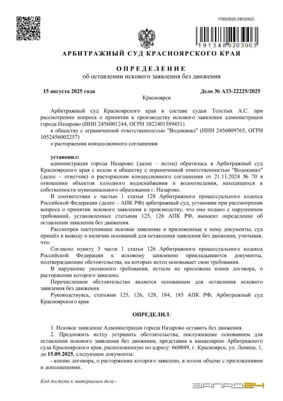 В Назарово пытающиеся расторгнуть концессию с «Водоканалом» власти не смогли качественно собрать документы в суд Администрация города Назарово пытается расторгнуть концессионное соглашение от 21.11.2024 года в отношении городских сетей водоснабжения и водоотведения с ООО «Водоканал». Информация о поступившем иске размещена на сайте Арбитражного суда Красноярского края. Согласно определению суда, вынесенному 15 августа этого года, заявления оставлено без движения, поскольку юристы администрации города не подготовили документы в суд должным образом. «Рассмотрев поступившее исковое заявление и приложенные к нему документы, суд пришёл к выводу о наличии оснований для оставления заявления без движения, учитывая, что согласно пункту 3 части 1 статьи 126 Арбитражного процессуального кодекса Российской Федерации к исковому заявлению прикладываются документы, подтверждающие обстоятельства, на которых истец основывает свои требования. В нарушение указанного требования, истцом не приложена копи