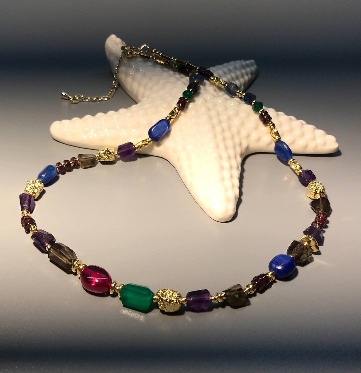 Колье с натуральными камнями. Розовая шпинель и зелёный хризопраз - акцентные камни вокруг спокойных раухтопазов, эмоциональных кианитов и дарящих умиротворение аметистов. Яркие украшения дают нам уверенность в себе, в том что мы делаем и чем занимаемся. Носите радугу минералов и освещайте себя светом камней. Колье в наличии , ждёт свою хозяйку. Вопросы и дополнительное фото в ЛС.