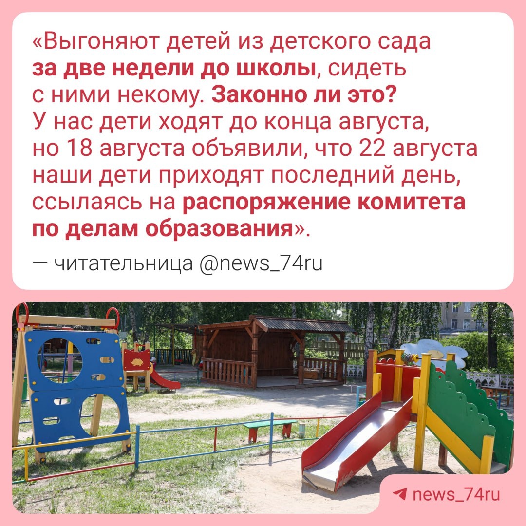 Родителей дошколят в Челябинске возмутило требование «выпуститься» из садика за две недели до 1 сентября Мама будущего первоклассника рассказывает, что заведующая вошла в ее положение и разрешила походить ещё одну неделю, но таких детей много, что делать остальным — вопрос. Руководство оправдывает это неким распоряжением городского комитета по делам образования. Правда, представители ведомства сообщили нам, что никакого распоряжения о досрочном выпуске из детсадов не существует. «Дети могут посещать детский сад до окончания договора об образовании, который заключен между садиком и родителями», — подчеркнули в комитете.