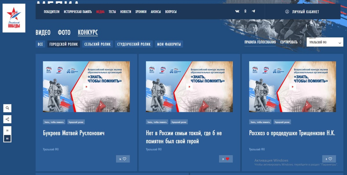 В этом году Всероссийский конкурс музеев образовательных организаций «Знать, чтобы помнить», посвящённый 80-летию Великой Победы и реализуемый в рамках партпроекта «Историческая память», проводится в особом формате. Он объединяет школьные и вузовские музеи, которые бережно хранят память о подвигах защитников Отечества, о тяготах военного детства, о жизни в тылу и о тех, кто вернулся с фронта. В 2025 году в региональном этапе конкурса приняли участие 2387 музеев из 82 регионов страны. В настоящее время завершается федеральный этап, и впервые в истории конкурса у всех желающих появилась возможность непосредственно повлиять на выбор победителей в новой номинации – за лучшие авторские видеоролики. Голосуй на сайте: https://диктантпобеды.рф/media Эти работы созданы самими обучающимися и повествуют о жизни и подвигах их родственников и предков – участников Великой Отечественной войны, блокадников, узников концлагерей, тружеников тыла и детей войны. На сайт конкурса уже поступило 188 виде