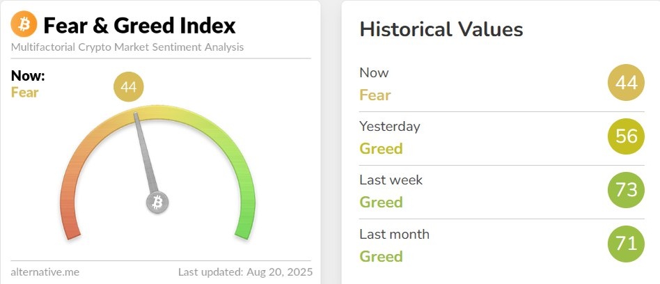 Индекс страха и жадности криптовалют упал до 44, войдя в зону «страха