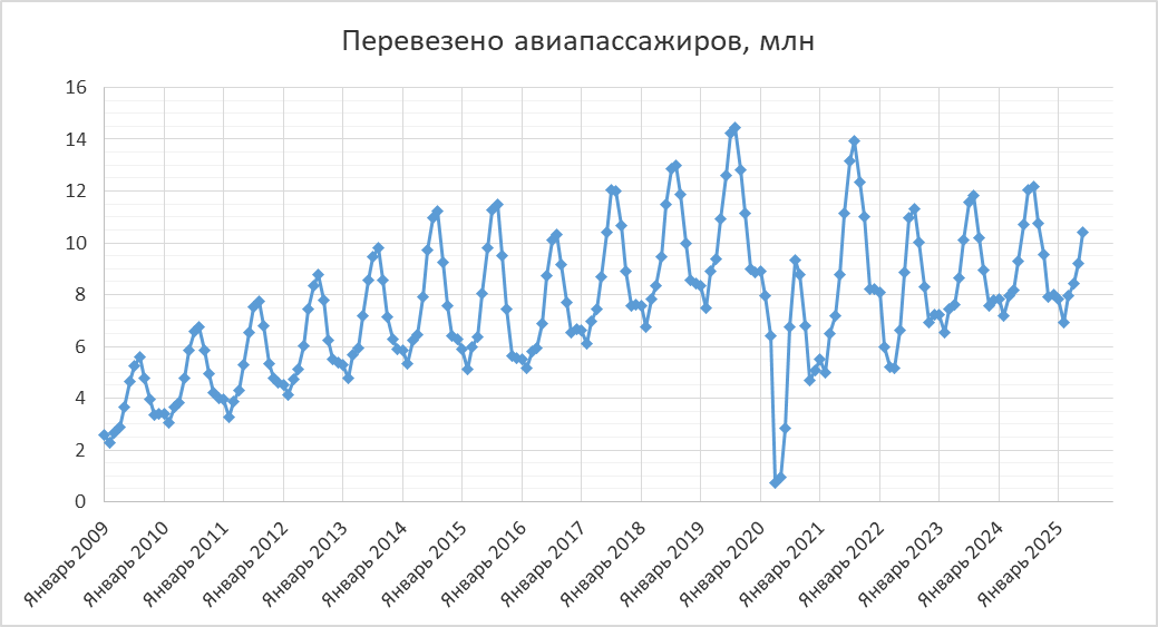 В общем, видно, что этот год характеризуется стагнацией (по внутренним - ещё с конца прошлого года) и даже некоторым, на пару процентов в последние 2 месяца (не берём в расчёт февраль т.к. в 2024-м он был високосным), снижением. Внутренние перевозки не дотянули до максимума начала 2022-го, а международные превзошли его, но надо понимать, что в начале 22-го всё ещё действовали ковидные ограничения, и показатели начала 2020-го почти в 2 раза больше нынешних.