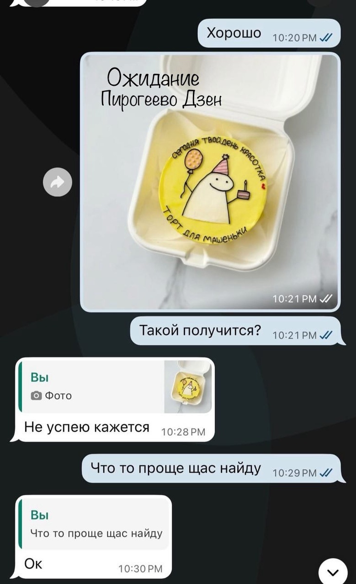 "Здравствуйте! Очень хорошо понимаю всех, кто обижается на кондитеров из-за их невнимательности. Я понимаю, что много заказов, что недосыпы и работа наизнос - это реалии многих творческих и ручных профессий. Однако если вы позиционируете себя как профессионал и берете деньги за свой труд, то ключевая часть этого труда - это не только умение печь бисквиты и собирать коржи, но и грамотно выстраивать рабочий процесс, правильно рассчитывать свои силы и ресурсы. Цель - не просто «сделать», а сделать качественно и в соответствии с ожиданиями заказчика, чтобы не разочаровывать людей в самый ответственный момент. В своей ситуации я обратилась с срочным заказом к домашнему кондитеру, которая на первый взгляд показалась мне абсолютно адекватной: и по ценам, и по представленному в портфолио качеству работ. Мне нужно было сделать торт сестренке на день рождения, и очень хотелось, чтобы он был не просто вкусным, но и визуально аккуратным, с красивой и главное - правильной - надписью. Я, как сознат