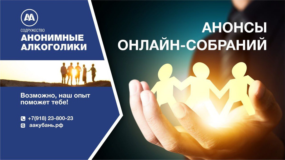 Онлайн-поддержка для всех! Дорогие друзья! У вас есть возможность получить поддержку, не выходя из дома. Регулярно проходят онлайн-собрания Содружества АА для тех, кто по каким-либо причинам не может присутствовать лично. Главное преимущество – вы можете присоединиться к собранию из любой точки мира! Не теряйте связь с нашей программой выздоровления. Расписание всех онлайн-собраний и подробная информация доступны по ссылке или по номеру телефона: +7(918)23-800-23 Также в Краснодарском крае действуют местные онлайн группы. Присоединиться к трансляции можно здесь. Помните: помощь рядом, когда бы вы ни решили обратиться. Мы всегда готовы поддержать вас! #ОнлайнСобранияАА