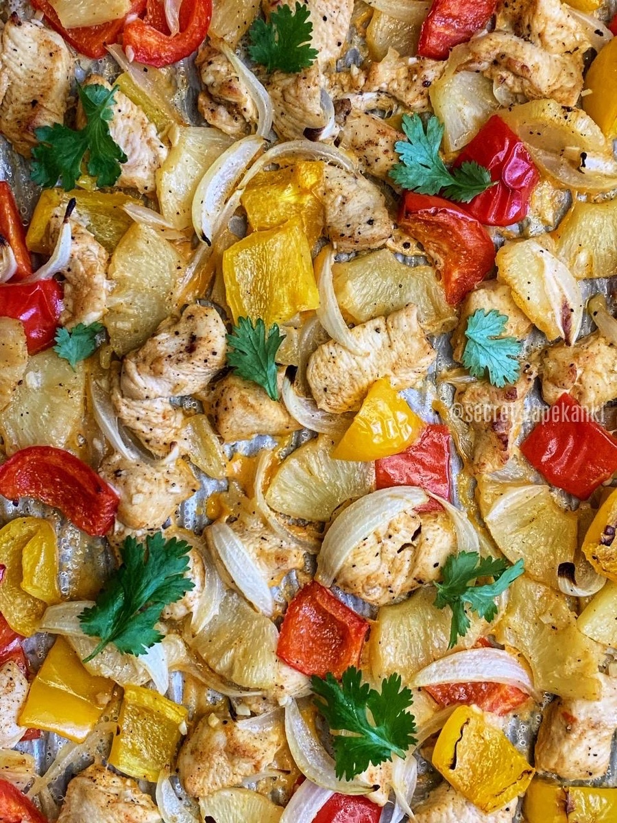 Посвящается всем, кто в этом году так же остался без отпуска, и тем, кто мужественно принял нашу порцию загара на себя. Любимая курочка этого лета. Готовила её в самые знойные московские будни и мечтала оказаться в отпуске… там где играет укулеле, шелестят пальмы и доносятся ароматы цветочных бус. Что понадобится: - филе куриной грудки 550 г - паприка 1/2 ч. л. (сладкая или копчёная) - перец красный острый по вкусу - соль, перец - масло оливковое 2 ст. л. - лайм 1 шт. (сок) - чеснок 3 зубчика - перец болгарский 2 шт. - лук 1 шт. - ананасы кольцами консервированные 1 банка (435 г) - сок от ананасов 2-3 ст. л. - кинза для подачи Противень, пергамент силиконизированный. Филе нарезаем кубиком. Добавляем специи, масло, сок лайма, мелко нарубленный чеснок. Перемешиваем и даём немного промариноваться. А пока занимаемся овощами. Перец очищаем и нарезаем квадратами, лук перьями. Ананас нарезаем произвольными секторами – крупно или мелко на ваше усмотрение. Добавляем сок от ан
