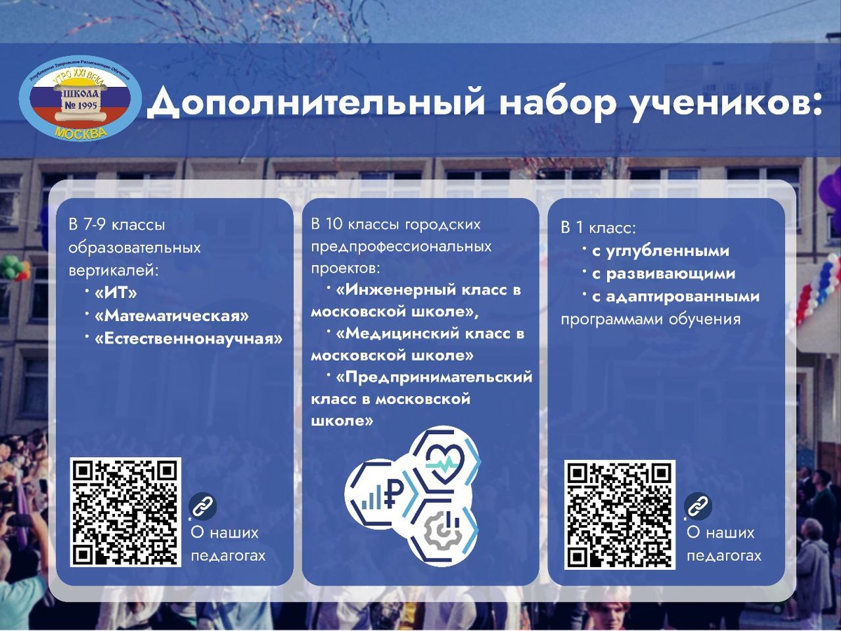 Мы объявляем дополнительный набор учеников! ⚙ В 7-9 классы образовательных вертикалей «ИТ», «Математическая», «Естественнонаучная» 🎓 В 10 классы городских предпрофессиональных проектов «Инженерный класс в московской школе», «Медицинский класс в московской школе», «Предпринимательский класс в московской школе» 🎓 В 1 класс с углубленными, развивающими и адаптированными программами обучения. Чтобы узнать подробности 📬Напишите на наш адрес электронной почты: 1995@edu.mos.ru 📞 Или позвоните по телефону: +7 (495) 438-95-67 #ДОНМ #ШколыКолледжиМосквы #школа1995
