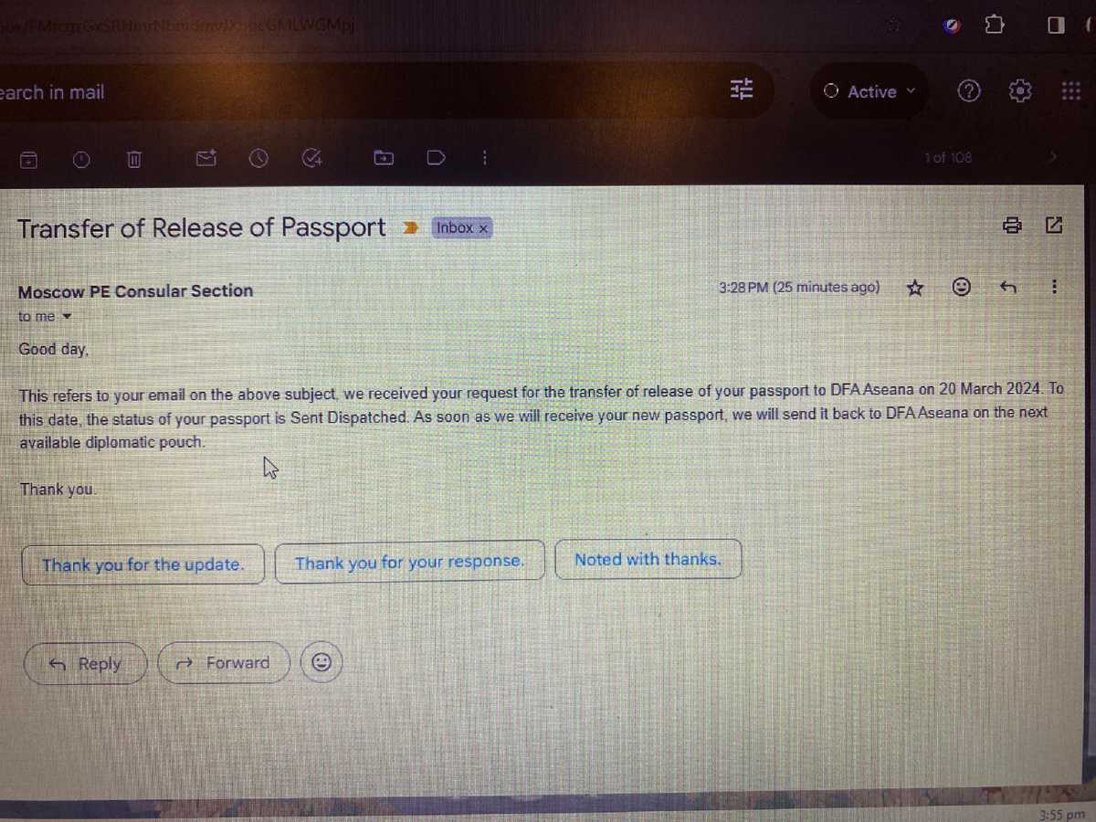Добрый день, это относится к вашему электронному письму по указанной выше теме. Мы получили ваш запрос на передачу выдачи вашего паспорта в DFA Aseana 20 марта 2024 года. На данный момент ваш паспорт находится в статусе «Отправлено». Как только мы получим ваш новый паспорт, мы отправим его обратно в DFA Aseana со следующей доступной дипломатической почтой. Спасибо.
