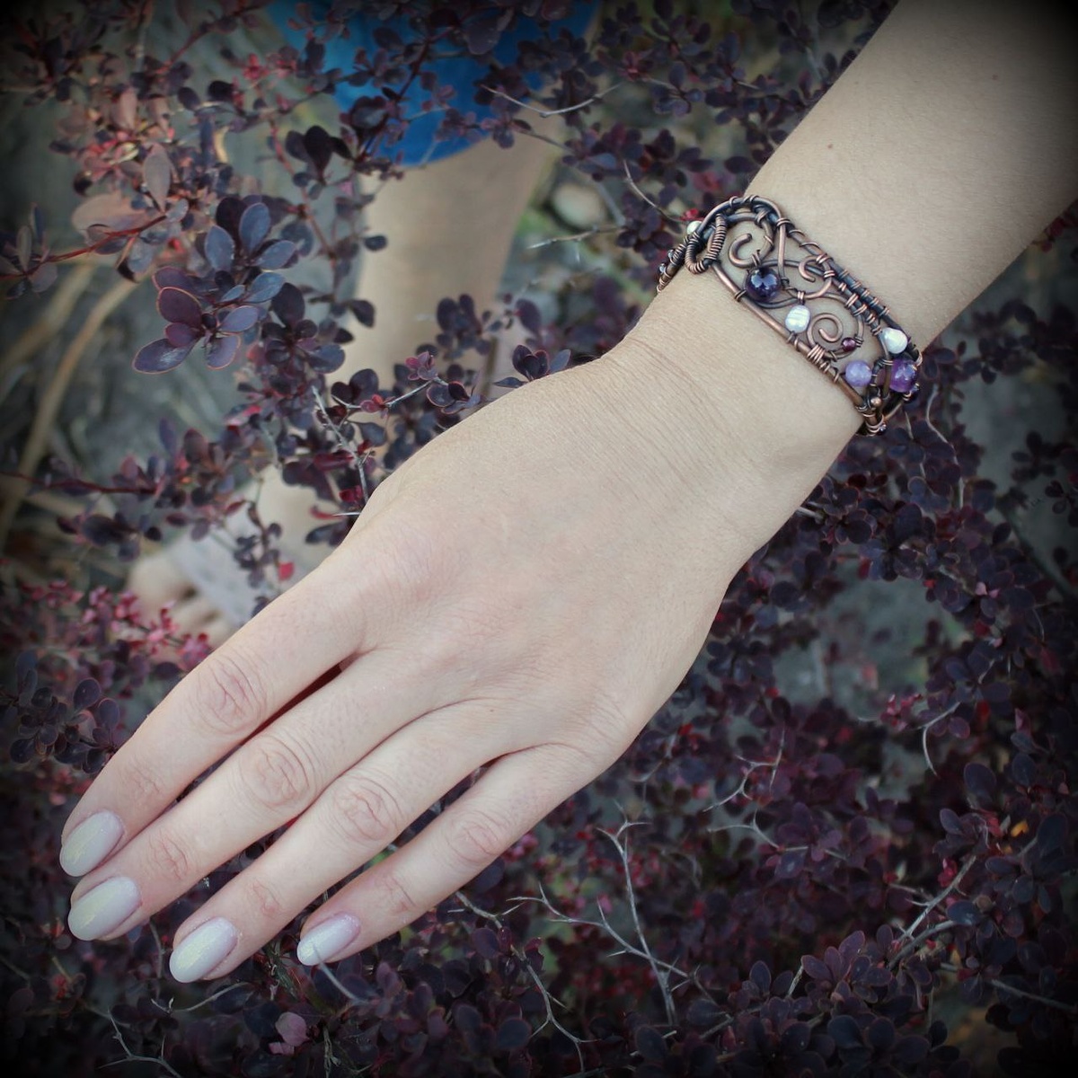 Браслет Л'ха-Ата, с гранатом и аметистом Жесткий медный браслет с гранатом, аметистом и натуральным жемчугом. Камни красивых оттенков от нежно-сиреневого до глубокого фиолетового. Браслет асимметричный, жесткий, с удобной застежкой. Регулируется от 16 до 22 см. Есть удлинительная цепочка. Медь покрыта патиной и отшлифована для проявления рисунка. Примерно, на руку обхватом от 16 до 22 см. Ширина браслета 2-3 см. #медныесказки #ручнаяработа #браслетручнойработы #медныйбраслет #аметист #гранат #жесткийбраслет #украшенияручнойработы