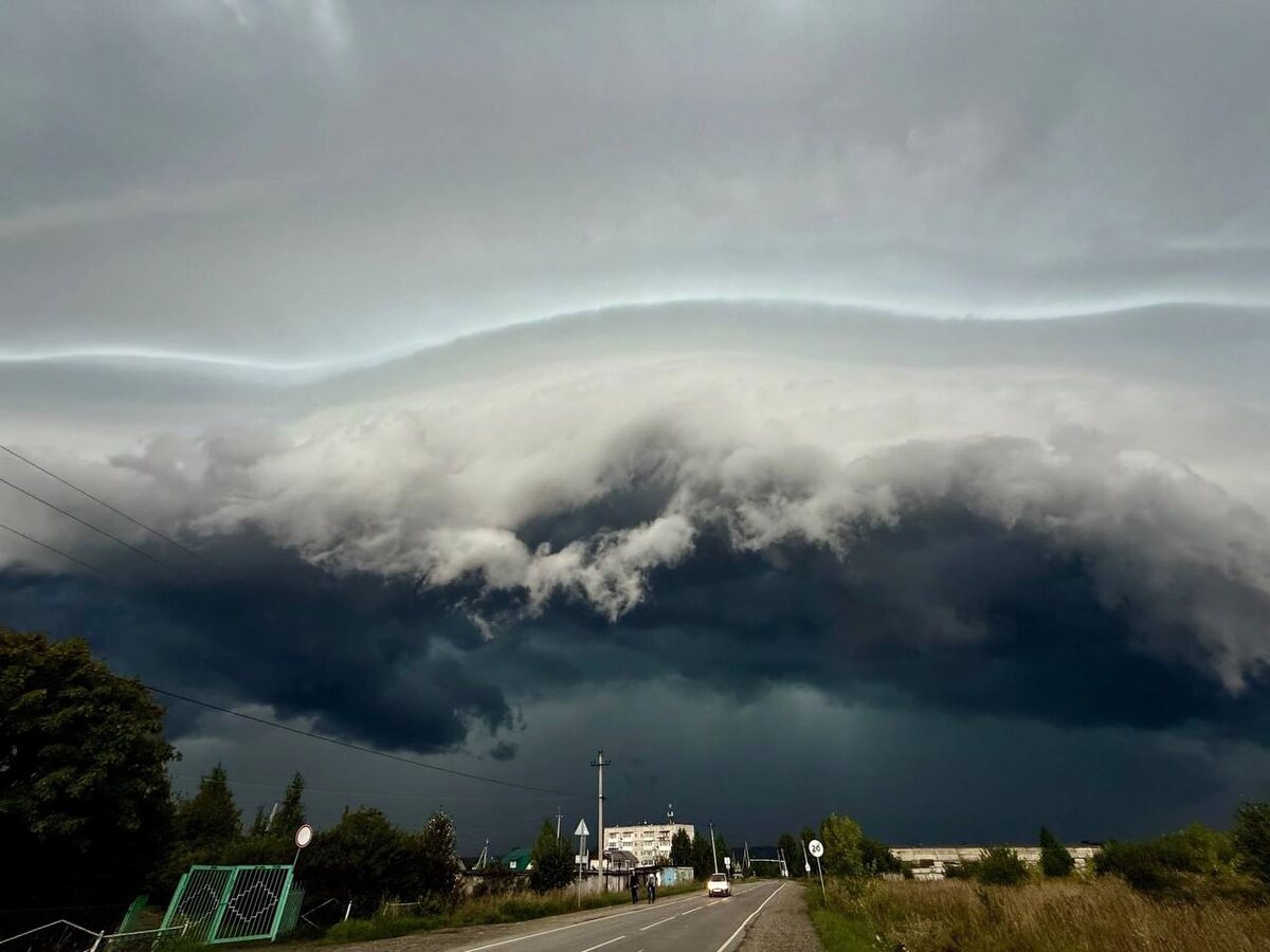 Очевидцы сфотографировали приближение структурного шквалового ворота вчера вечером. Его нередко путают с торнадо, однако ворот не оставляет после себя серьезных разрушений.