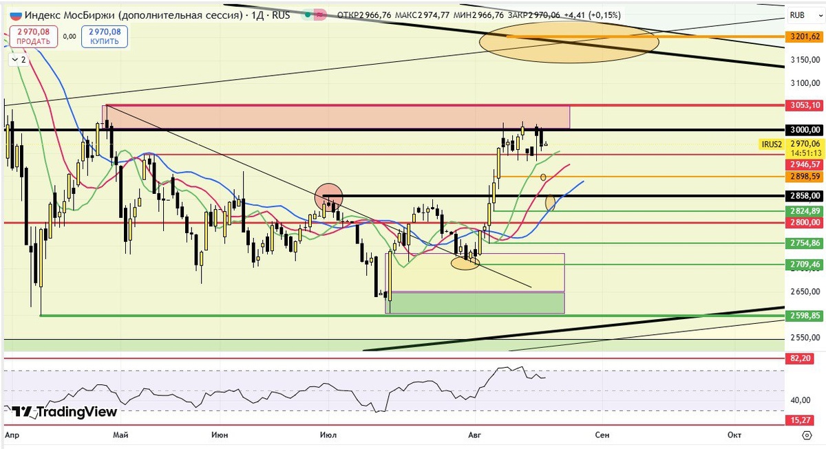 🏦 #Индекс_ММВБ ТФ 1Д Ни туда и ни сюда... Индекс Мосбиржи продолжает "бег на месте". С одной стороны, рынок "прайсит" процесс мирного урегулирования, но с другой, опасается провокаций со стороны "воинствующей" Европы во главе со всякими "МЕРЦкими" Макронами, Калласами и фон дер Ляйнами, которые перед Трампом проявляли заботу о мире, но после того, как их отпустил Белый порошок Дом, снова заговорили о санкциях и продолжении войны чужими руками... Эх, дать бы вам коленом под зад... Рубль на фоне геополитики и повышенном спросе к российским активам со стороны нерезидентов (что подтверждается ростом RGBI), не хочет сдавать позиции. Нефть под давлением, на фоне возможной "разрядки" в отношении России. Оба этих фактора в какой-то степени сдерживают рост экспортеров. 📈 Все эти факторы отображаются на графике консолидацией в узком диапазоне 2930-3010 пунктов. Рынок ждёт конкретики для определения устойчивого тренда, а пока её нет, будет реагировать нервными импульсивными движениями в раз