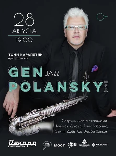 Gen Polansky и Тони Карапетян Победитель Hollywood Music In Media Awards, саксофонист, композитор и продюсер. Американский талантливый музыкант, выступавший и сотрудничавший со всемирно известными музыкантами, такими как: Куинси Джонс, Стинг, Тони Роббинс, Дэйв Коз, легенда джаза Херби Хэнкок. Gen Polansky - свободно переходит от джаза к року, поп, соулу, фанку и R&B, латино-бразильской и современной музыке, как исполнитель и композитор. Музыкальные выступления Gen Polansky всегда вдохновлены всем лучшим из джаза, диско, соула, танцевальной музыки и ритм-н-блюза. Однако он добавляет к этому современное звучание и собственное прочтение происходящего в мире и музыке сегодня. Gen создал глубоко личный и уникальный сплав музыкальных жанров и влияний, объединённых его насыщенным и выразительным звуком саксофона, демонстрируя поразительную универсальность. четверг 28 августа, 19:00 Центр культуры «Рекорд» 0+ 🎟 2200 - 3000 руб. 😄 Мероприятия Нижний Новгород. Я местный!