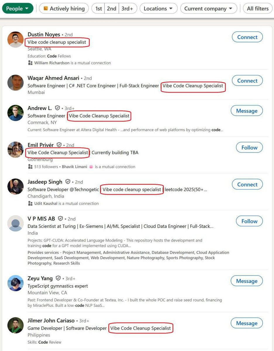 Парни, записываем: Vibe code cleanup specialist Разрабы на LinkedIn массово добавляют новую профессию себе в резюме. Суть проста: подчищать код, за теми, кто навайбкодил своё чудо-приложение и не понимает, как исправить это недорозумение от багов и костылей. Современный клининг — требует современных решений 😁