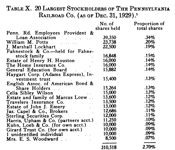 Мы уже видели, что крупнейший акционер Pennsylvania Railroad владел всего лишь 0.34% от общего количества акций, находящихся в обращении. Следующему по величине владельцу принадлежало всего 0.2% процента, в то время как совокупные активы двадцати крупнейших владельцев составляли лишь 2,7 % от общего объема акций. Всего 236 акционеров владели более чем 500 акциями каждый (0,004%), а их совокупные владения составляли менее 5% от общего числа. Очевидно, что ни один человек или небольшая группа не могли доминировать в компании благодаря владению акциями, что еще больше подчеркивается неоднородным характером списка крупнейших держателей.