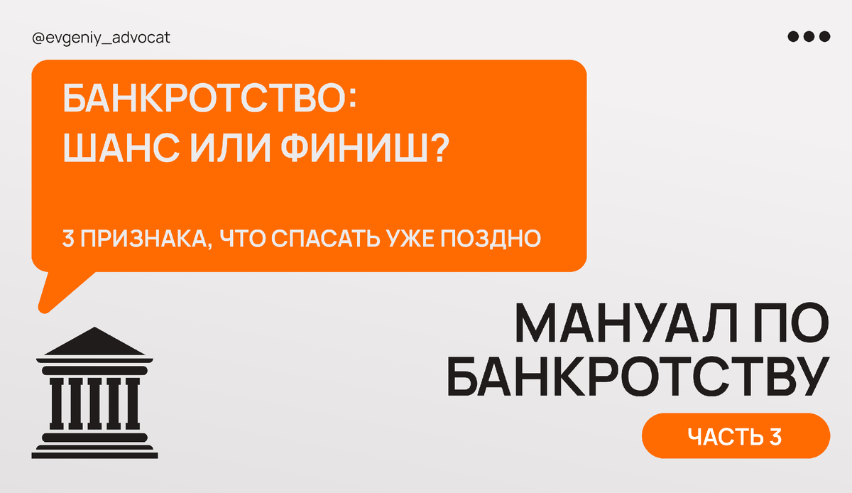 Если вы здесь, значит банкротство компании — уже не теория. Ниже — про случаи, когда бороться поздно и что ещё можно сделать. Этот материал — часть мануала о банкротстве бизнеса и субсидиарной ответственности для его топ-менеджеров: Иногда честнее и правильнее всего признать: спасать нечего. Это означает, что вы даже не можете законно платить по своим обязательствам контрагентам. Если будете делать это через третьих лиц — можно получить уголовную статью (ст. 199.2 УК РФ). А долги тем временем растут, появляются новые кредиторы. В реестре уже есть те, кто в открытую действует против вас. В этом случае борьба за компанию — это иллюзия. Все усилия, деньги и время, которые вы вложите в неё, пойдут впустую. И, возможно, ещё ухудшат ваше положение как директора. Подробно о том, как проверить, есть ли у компании ещё шанс на спасение, мы разбирали в Части №2. Здесь же речь пойдёт о ситуациях, когда бороться за бизнес уже поздно. Если заявление о банкротстве в суд ещё не подано, но вы понимает