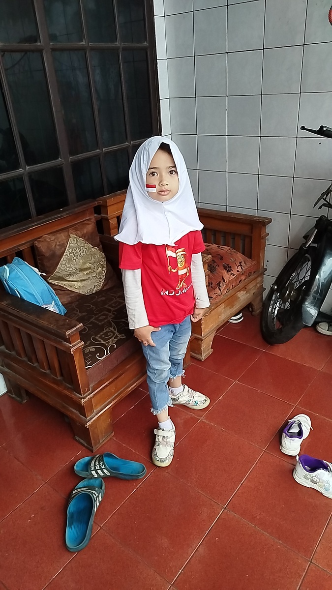 В среду в школе у Амиры проходили праздничные конкурсы в честь Дня независимости. Форма одежды - что-нибудь красное с белым. Амира надела футболку с Тун-Тун Сауром Наклейку хранит с 17-го числа - достала где-то во время отмечания в соседнем квартале. Один из конкурсов в школе был такой: пронести стеклянный шарик в ложке и не уронить Ели арбуз на скорость Прыгали в мешках, ели крупук, висящий на верëвочке, перетягивали канат Ползали в коробках В конце всем выдали медали - брелки на красно-белых ленточках Вот она вблизи А вот видео ползания в коробках