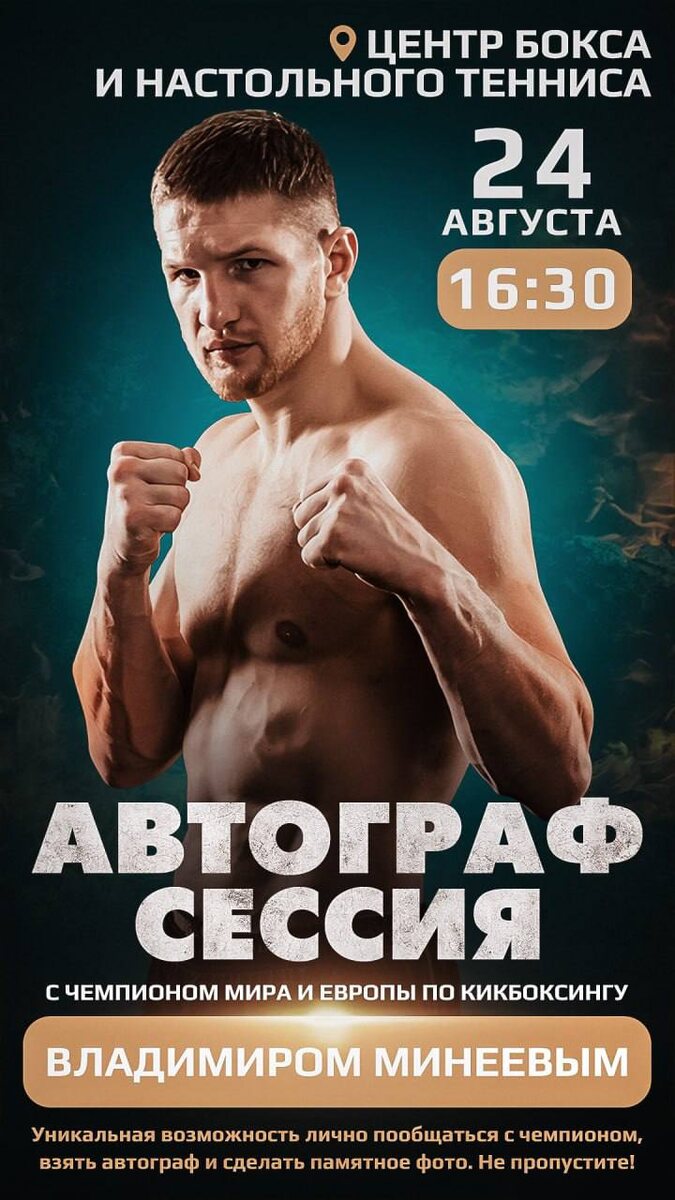 С 22 по 24 августа столица Татарстана станет центром силы, скорости и невероятной спортивной воли! В «Центре бокса и настольного тенниса» пройдет Открытый межрегиональный турнир по кикбоксингу — «Кубок Мэра Казани». ⚔️Дисциплины: • Фулл-контакт • К-1 На ринг выйдут около 200 сильнейших спортсменов из более чем 10 регионов России, чтобы сразиться за звание лучшего в одном из самых зрелищных видов спорта. 24 августа на турнире состоится встреча с легендой российских единоборств — Владимиром Константиновичем Минеевым! 🏆Чемпион мира и Европы по кикбоксингу 💪Мастер спорта ✨Яркий боец смешанных стилей (MMA) У вас будет уникальная возможность лично пообщаться с чемпионом, взять автограф и сделать памятное фото на персональной автограф- и фотосессии. Не пропустите! ⏰Начало сессии с Минеевым: 24 августа в 16:30 📍Где: Казань, «Центр бокса и настольного тенниса»ул. Джаудата Файзи, 2А Приходите поддержать спортсменов и зарядиться неукротимой энергией настоящего кикбоксинга! Больше информа