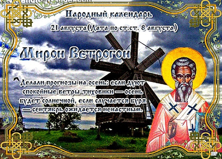 В четверг 21 августа 2025 года Православная церковь почитает память святителя Мирона чудотворца, епископа Критского. В молодые годы Мирон был семейным человеком, занимался земледелием. Он прославился своей добротой, оказывал помощь всем, кто к нему обращался. Однажды, застав воров на своем гумне, святой помог им поднять на плечи мешки с зерном. Великодушие Мирона устыдило воров и они стали вести праведную жизнь. ❇️ПРИМЕТЫ ✔️Каков Ветрогон – таким и январь будет. ✔️Иней в этот день обещает хороший урожай в следующем году. ✔️Мироны-ветрогоны по дороге пыль гонят, по красному лету стонут. ✔️Если дует ветер с юга, то начинает поспевать овес. ✔️Хороший урожай ягод – к холодной зиме. ✔️Если день жаркий, то осень будет теплой. Если дождливый – дождливой. ✔️Ненастье в этот день будет иметь затяжной характер и продержится до Бабьего лета. ✔️Северный ветер дует – к похолоданию и богатому урожаю ржи. ✔️Если в полдень на реке ряби не видно, то осень будет теплой, а зима – мягкой. ✔️Большой урож