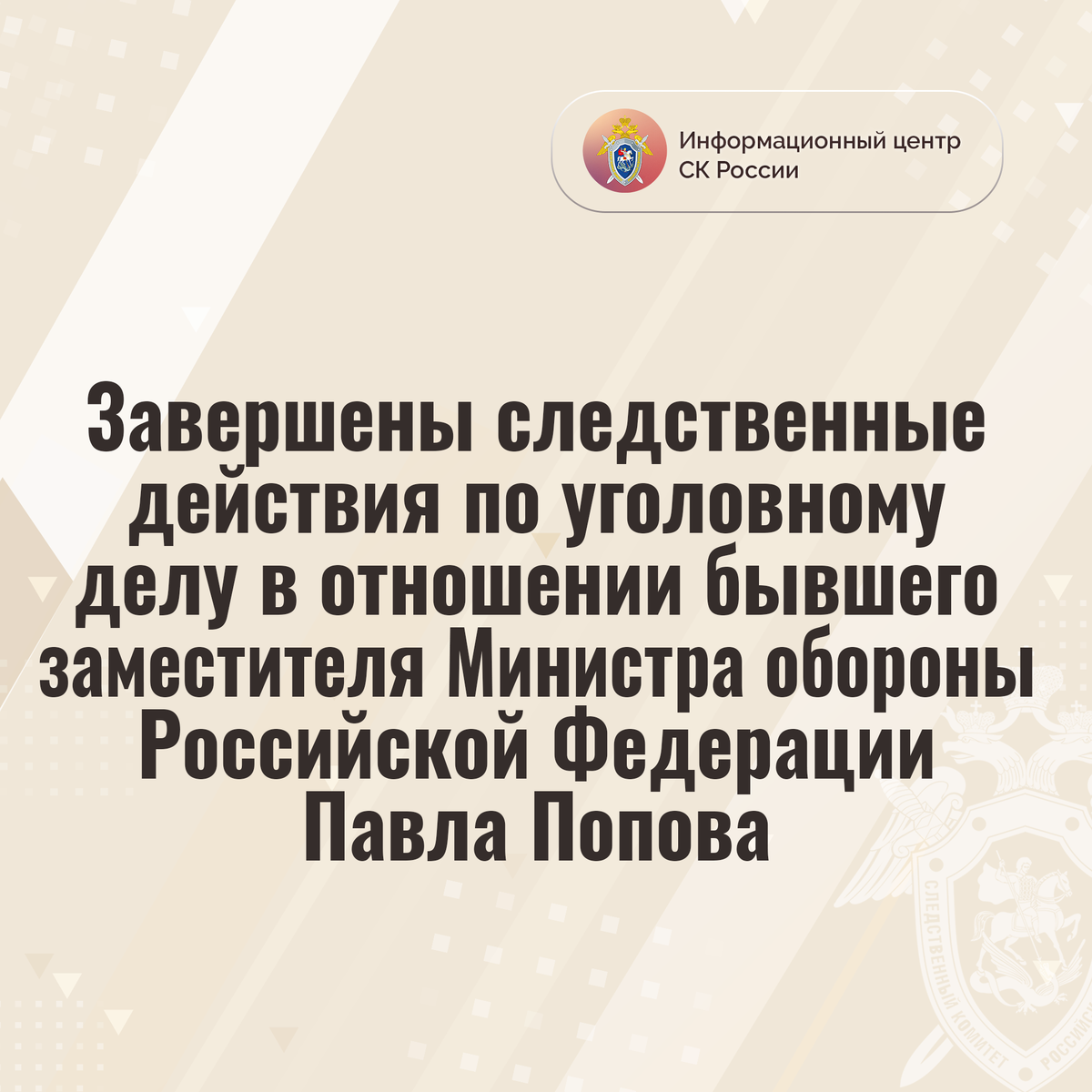 Главным военным следственным управлением СК России завершены следственные действия по уголовному делу в отношении бывшего заместителя Министра обороны Российской Федерации Павла Попова. Он обвиняется в совершении преступлений, предусмотренных ч. 6 ст. 290, ч. 4 ст. 159, ч. 2 ст. 292,