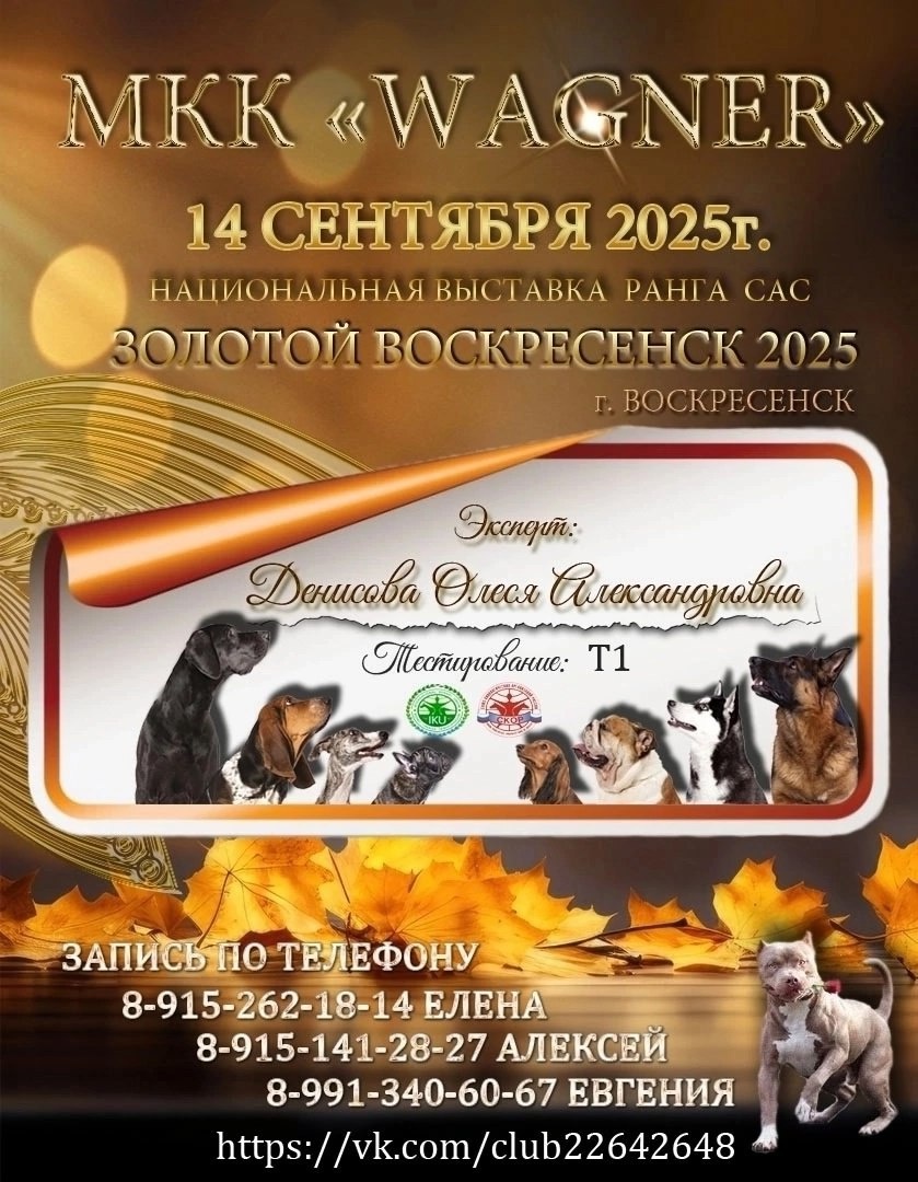 ⏰ 14 сен (25д) 🏛 #Воскресенск #Москва #Россия #Выставка 🐶 Выставка собак: Золотой Воскресенск 🏆 Кинологический клуб "Вагнер" Контакты и вопросы организаторам здесь: 🌐 https://www.petsman.ru/vystavki-sobak.php?mesto=165-voskresensk