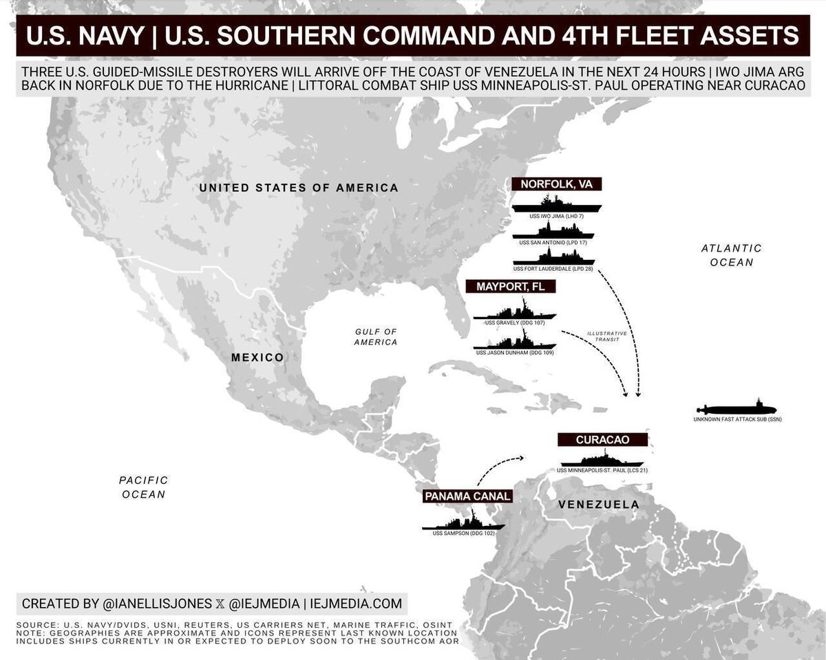 Администрация США объявила о награде в $50 млн за информацию о связях президента Венесуэлы Николаса Мадуро с наркокартелями. Одновременно у побережья страны замечена группировка ВМС США, включающая три эсминца и атомную подлодку. В ответ Мадуро запретил использование дронов для всех, кроме силовых структур, что рассматривается как мера против возможных угроз.