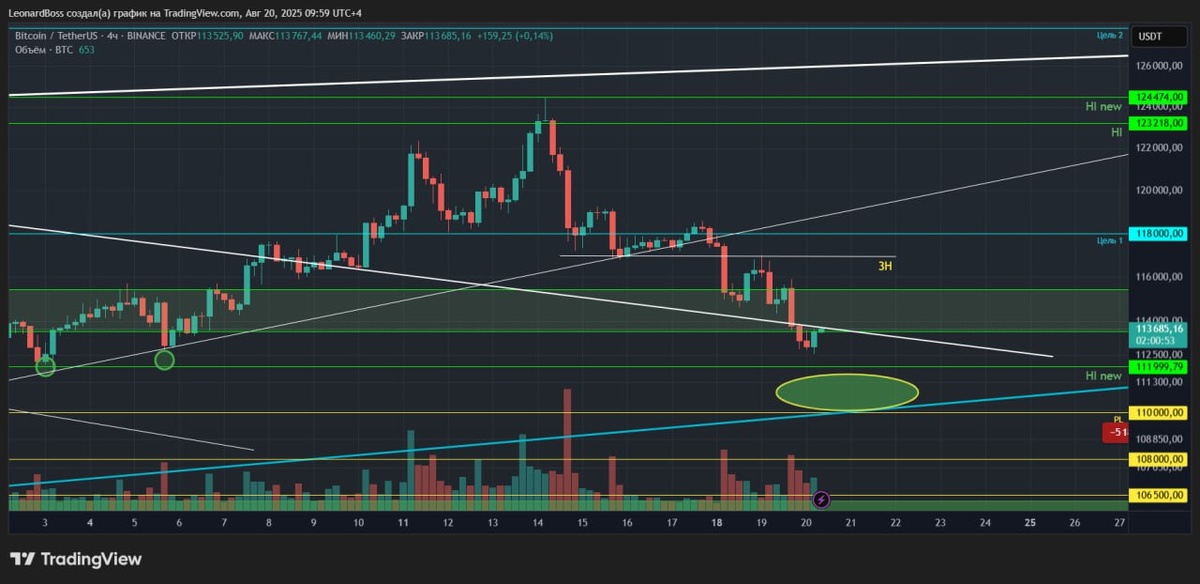 В ответ на пост #BTC 🕯Локально🕯 ⚠️Доброе утро, коллеги! Всё же, как бы мне не хотелось по раньше увидеть остановку коррекции, начальный сценарий с красным понедельником и вторником оказался прямо в цель! По битку подобрались к обозначенной зоне, продавив тем самым и блок, и трендовую!! ⚠️Вчерашний день закрылся "красивой") полнотелой красной свечой, которая в большинстве случаев указывает на продолжение тренда, а именно снижение прямо к нашему уровню было бы идеально. Но, при таком сценарии есть достаточная опасность дальнейшего снижения, поскольку касание уровня 112К завершит формирование идеальной фигуры ДВ на дневке = отработка которой смотрит прямиком в зону уровня 100К!! ⚠️Почему же в таком случае я разместил зону снижения так рядом и обращаю внимание на ближайшую трендовую у уровня 110К?? Да всё просто, друзья: фигуру ДВ видит большинство трейдеров (не инвесторов), большинство индикаторов написанный в соответствии с ТА также определяют опасность. При этом, за чуть более меся