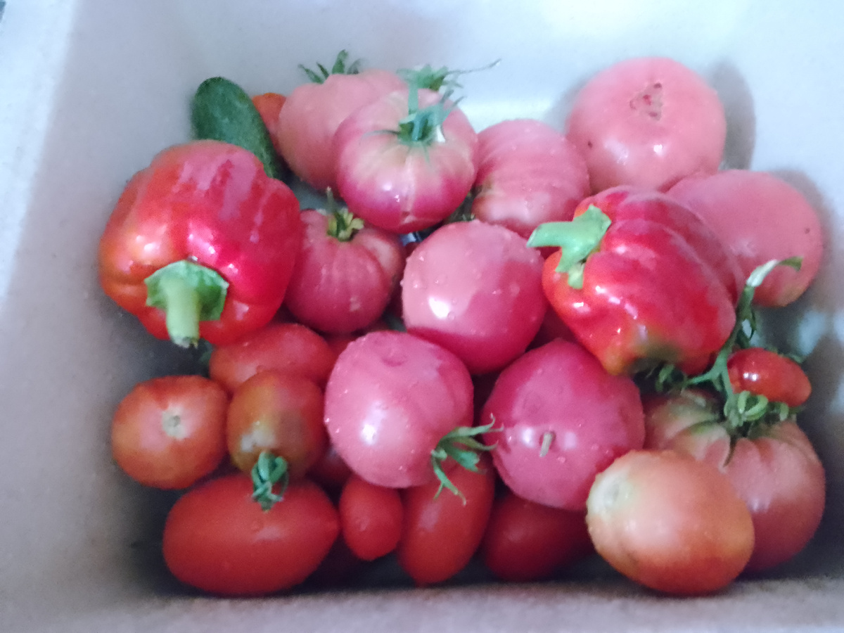 Часть мясистые огромные, которые на еду.Часть для разносолов, сорт так и называется "Домашние разносолы". Но вымахали они здоровые, с толстой кожицей, в банку трёхлитровую не захотела. Не едим мы зимой помидоры трехлитровыми банками. Чего с ними делать. Решила, из "Домашних разносолов" делаю вяленые помидоры, а из "Розового слона" сок томатный.