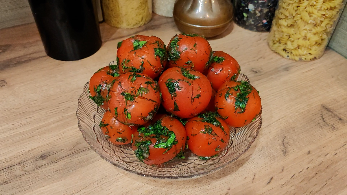 Если вам надоели скучные свежие помидоры, но возиться с консервацией нет ни времени, ни желания, этот рецепт для вас. За полчаса обычные помидоры превращаются в ароматную, пикантную закуску, которая улетает со стола быстрее, чем кот обнаруживает открытый холодильник. Берем: Делаем: Зелень мелко рубим, не до состояния пыли, но и не огромными ветками. Чеснок пропускаем через пресс или трем на мелкой терке. Если пресса нет, можно просто очень мелко порубить. В миске соединяем зелень, чеснок, соль, перец и хрен. Если смесь кажется суховатой, можно добавить 1 ст. л. растительного масла, но это не обязательно. Тщательно моем и обсушиваем томаты. У каждого удаляем плодоножку и делаем крестообразный надрез сверху, но не до конца, примерно до середины, чтобы помидор не развалился. Два варианта заправки: - Аккуратно начинить каждый помидор смесью (удобно чайной ложкой или пальцами). - Сложить томаты в пакет или контейнер, выложить заправку и аккуратно перемешать, так, чтобы не помять помидоры. У