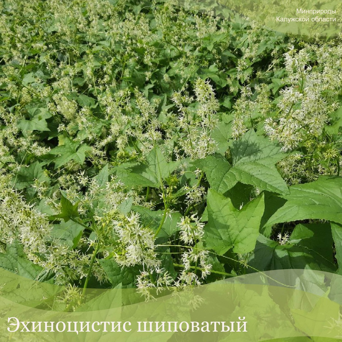 🌿С каждым годом все чаще и чаще по берегам водоемов попадается растение, включенное в мониторинговый список Черной книги Калужской области. Речь идет об эхиноцистисе шиповатом, или лопастном – однолетней травянистой лиане со стеблями длиной до 6 м и более, светло-зелеными листьями и белыми или желтовато-белыми цветками, собранными в метелки. 🌿Это североамериканский вид. В нашем регионе он впервые собран в 1971 году в Юхновском районе. В настоящее время встречается по берегам многих других рек, где местами образует сплошные заросли. Иногда культивируется как декоративное и медоносное растение, ведь его цветки обладают тонким медовым ароматом. Кстати, у нас это растение еще иногда называют бешеным огурцом. 🌿При созревании они резко вскрываются, а находящиеся в них семена разбрасываются вокруг. Эти семена разносятся водой, поэтому все чаще растение можно встретить у водоемов.
