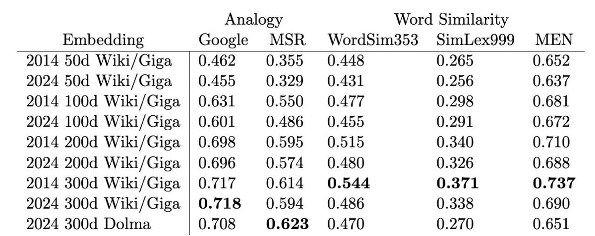 хочу поделиться статьей, которая меня удивила - я не думал, что в 2025 году кто-то всерьез продолжает заниматься контекстно-независимыми векторными представлениями слов (типа word2vec); однако реальность всегда богаче наших фантазий, и группа Кристофера Мэннинга выпустила статью про обновленный GloVe для оценивания, к примеру, они используют тот же WordSim353, как 10 лет назад; тут нужно оговориться, что каждый инструмент хорош для своих задач и для быстрой классификации, например, тот же fasttext все также отлично работает; но все равно, как на машине времени проехался @valuableai