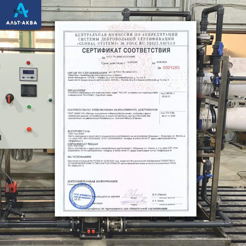 НПП «АльтАква» получило сертификат соответствия сейсмическим требованиям для мембранных установок «Альт М» и автоматических засыпных