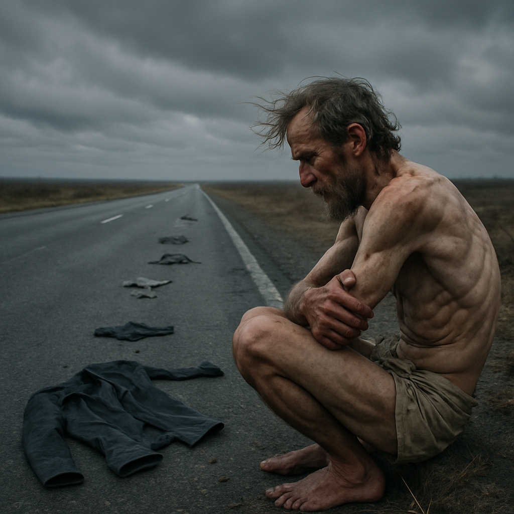 Последнее, что на нём есть — это штаны. Простые, честные штаны. Правдивость и четность. В них было неловко: они были чуть узковаты, жали в неудобных местах, когда пытался соврать, и сидели они немодно, без капли лоска. Он стягивает и их через ноги, пиная комком в кювет.