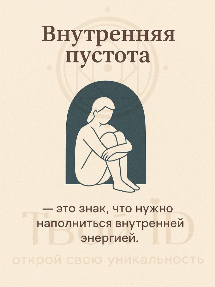 🪬Всё хорошо, но почему внутри так пусто? Знаешь то состояние, когда вроде всё нормально: работа, семья, друзья… но внутри словно зияет пустота? Ты улыбаешься окружающим, продолжаешь делать дела, а вечером, оставаясь наедине с собой, ловишь себя на мысли: “А зачем всё это? Почему я чувствую себя таким уставшим и потерянным?” Эта пустота — не враг. Она сигнал. Это душа, которая мягко, но настойчиво стучится в твоё сердце, говоря: “Ты живёшь не в своём потоке, не в своей энергии. Посмотри глубже”. 💕С точки зрения психологии- это может быть следствием вытесненных эмоций, непрожитых травм, привычки жить «по правилам других». 🌳А если смотреть через призму энергий, то пустота — это разрыв связи с источником своей силы, утечка энергии в старые сценарии и страхи. 👁️Очень часто именно в этом состоянии люди решаются на изменения: начинают искать свой путь, обращаются к психологу или энергопрактику. Ведь пустота — это не конец, это начало новой реальности. 🪬На консультациях я помогаю у
