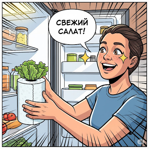 ЛОВИ ЛАЙФХАК Привет, друзья! Каждый из нас сталкивался с этой проблемой: купили свежий салат, положили в холодильник, а через пару дней он уже вялый и совсем не аппетитный. Кажется, что это неизбежно, но не спешите выбрасывать! У меня есть гениальный лайфхак, который поможет вам сохранить свежесть салата надолго. Лайфхак: бумажное полотенце для салата Как это работает? Магия здесь тоже проста, и для неё вам понадобится обычное бумажное полотенце. Да, то самое, что всегда есть на кухне. * Промойте и высушите: Тщательно промойте салат и высушите его, чтобы на листьях не осталось лишней влаги. * Упакуйте: Положите сухие листья салата в контейнер или пакет с застежкой. * Положите полотенце: Сверху положите свернутое бумажное полотенце. Оно должно плотно прилегать к салату. * Храните: Закройте контейнер и уберите в холодильник. Что происходит? Бумажное полотенце впитывает избыточную влагу, которая является главной причиной увядания салата. Листья остаются сухими, не гниют и не теряют св