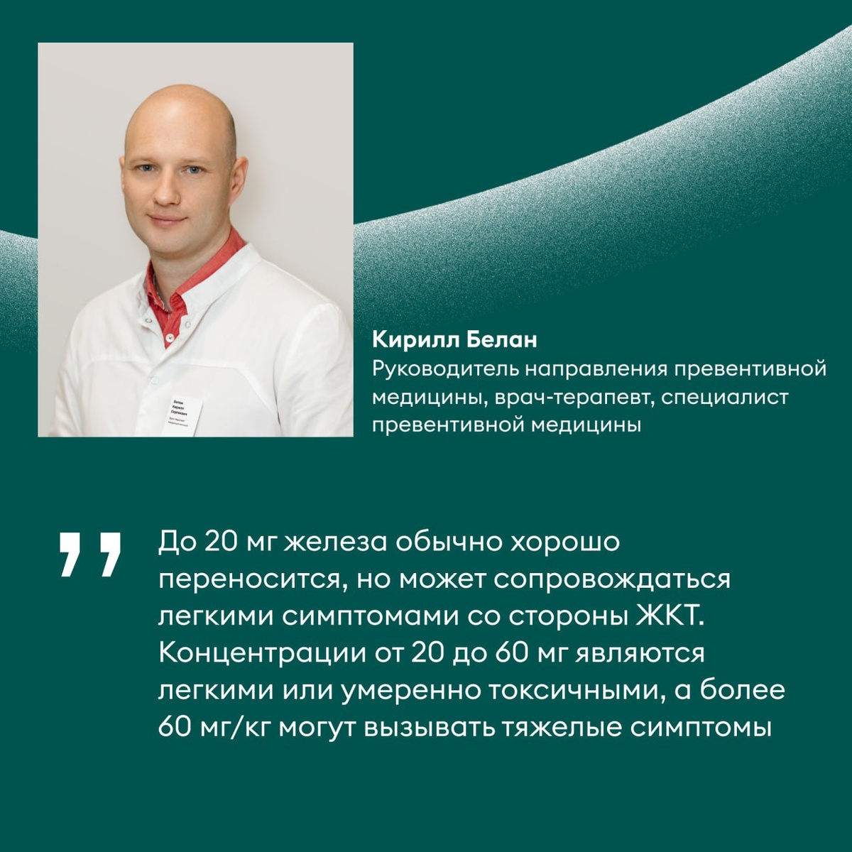 Ну мы же не железные...или железные? Важно: препараты железа можно принимать только по назначению врача. И лучше сразу обсудить с доктором особенности его усвоения. Далеко не все железо, которое человек получает с пищей или препаратами, усваивается: • При выраженном дефиците железа организм может усвоить 20-25% из 100 мг принятого железа • При скрытом дефиците усваивается только 10-13% • У здоровых мужчин усваивается до 5%, а у здоровых женщин — 5,6% • При терапии обычно назначают суточную дозу железа от 100 до 200 мг, но для восполнения дефицита может быть достаточно всего 15-30 мг в день Помогают усвоению железа: • Витамин С • Прием препаратов с железом не менее чем за 30 минут до еды или за 2 часа до других лекарств Мешают усвоению железа: • Некоторые продукты, в том числе богатые кальцием: во время терапии желательно снизить употребление молочных продуктов, чая, кофе и клетчатки • Лекарства, снижающие кислотность желудочного сока, такие как антациды и ингибиторы протонной помп