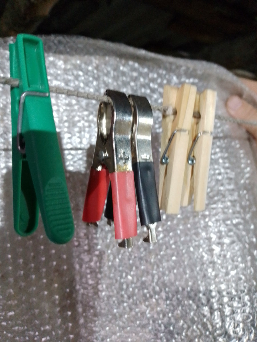 Привет ребята , наверно месяц назад потерял вот эти зажимы для аккумулятора куда-то думал они завалились , а нет оказываются они служат верой и правдой у нас на веревке ))) Отлично держат напряжение ⚡ трусы, носки и футболки ! Думаю что тоже идея хорошая ) пока не стал их забирать, стало интересно как они попали на веревку )