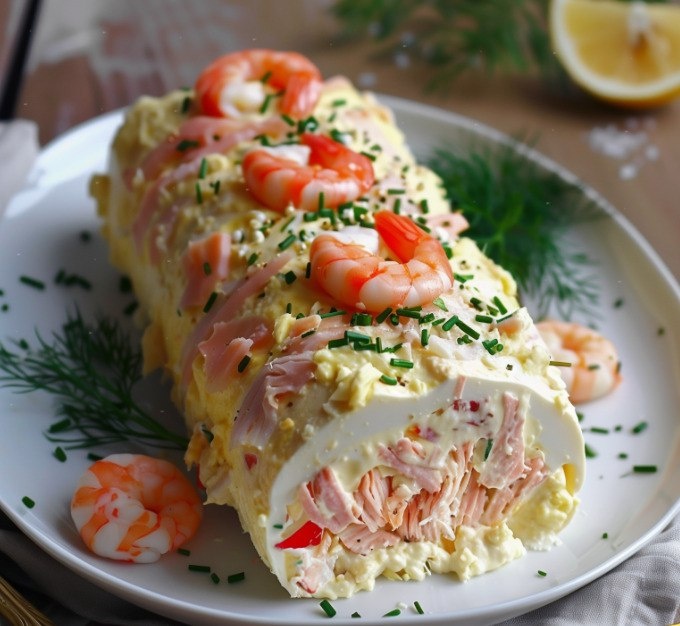 Праздничный рулет со вкусом моря: краб, копченый лосось и креветки.