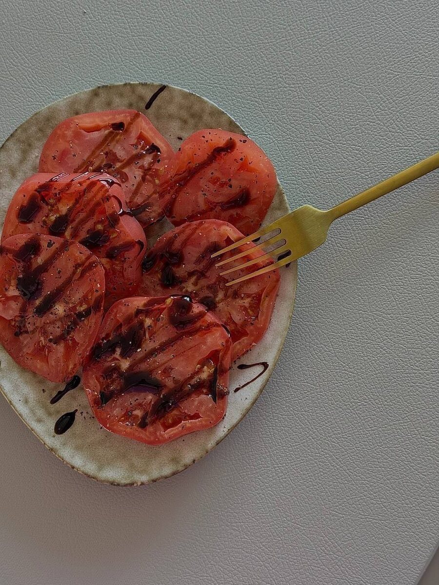 В последнее время полюбилось есть так помидоры. Режу кольцами, сверху смесь перцев, бальзамик, немного соли. Вкууусно!