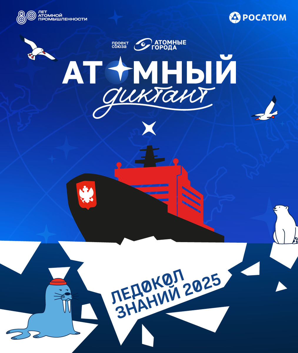 Северный полюс, 2025 год. Просветительский проект «Атомный диктант» впервые в истории вышел за пределы материков — и превратила ледовые просторы Арктики в самую необычную площадку для проверки знаний. Участники экспедиции «Ледокол знаний» написали диктант прямо на макушке планеты, среди бескрайних льдов Северного Ледовитого океана. Диктант там, где раньше были только белые медведи Вместо привычных парт и школьных досок — кают-компания атомного ледокола «50 лет Победы», а за окном — бесконечные ледяные поля. Диктант прошёл в формате интерактивного квиза: команды соревновались в знаниях об атомной энергетике, истории закрытых городов и прорывных технологиях будущего. Перед стартом интеллектуальной битвы участников ждал сюрприз — видеообращение от Фаины Милевской, заместителя генерального директора Союза «Атомные города». «Сегодня вы – часть нашей истории. Ваш интерес к знаниям, стремление понять сложные процессы и быть полезными своей стране – это основа будущего. Желаю вам успехов в Дик