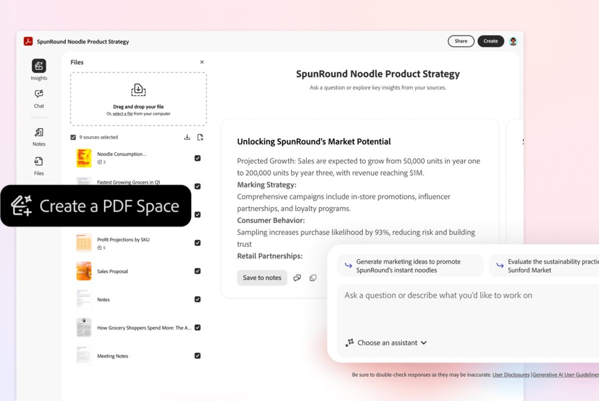Adobe представила платформу Acrobat Studio, где можно создавать базы знаний из документов и веб-страниц. Ориентироваться в них помогает ИИ-ассистент — например, чтобы систематизировать конспекты или подготовить отчёты.