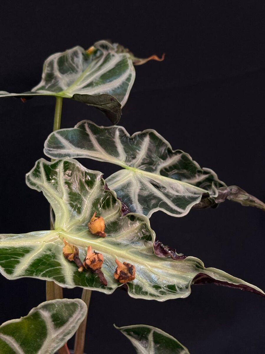 Алоказия Локо! Картошку, говорят, еще рано копать. Поэтому мы копали сегодня алоказии! Перед вами настоящая находка для любителей экзотических растений — #алоказия Локо и её клубни! Вы только посмотрите на эти листья сказочной формы, которые точно привлекут внимание ваших гостей: овально-треугольные, кожистые, с блестящей серебристо-зелёной верхней стороной и менее блестящей, но зелёно-фиолетовой нижней стороной. Каждый лист имеет волнистые края, что придаёт ему особую текстуру и характер. Края обрамлены тонкой светлой линией, что подчеркивает их форму. Листья растут на высоких стеблях, создавая эффектный силуэт. Если верить гуглу, то Локо не выселит вас из квартиры, как это могут сделать её подруги типа Алоказии Гагеана. В дикой природе листья Алоказии Локо достигают 25 см в длину и 10-12 см в ширину. А теперь представьте это роскошество у себя на полочке! Это растение не только красиво, но и требует определенного ухода, вот несколько простых рекомендаций: • Свет: Алоказия пред