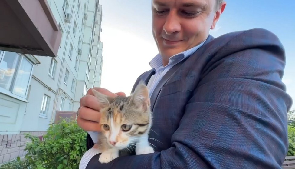 Мэр Ельца Вячеслав Жабин приютил спасенного котенка и выбирает кличку питомцу
