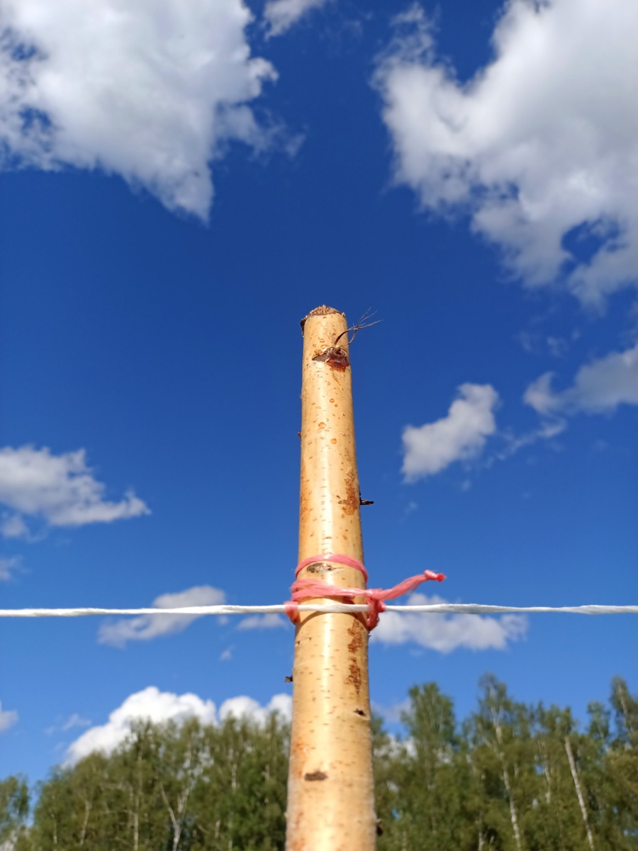 Для поддержания шнура использовал берёзовые стволы. Расчищал дорогу, там достаточного этого добра. На маил, сюразумеется. Столбики по 2,5 метра, углубляю на 70см. В землю креплю методом бутования: пустоты заполняю песком проливая водой. Сам шнур (белый) креплю на свободной петле (красным), чтоб натяжением-растяжением не разорвало его. Средний же и нижний ряд шнура просто обматывал вокруг столба. Не нужно мне лишних машин грибников на участке. Итого 9 столбов, интервалом 20 метров. Пару дней ушло. Заготовка, разметка и установка.